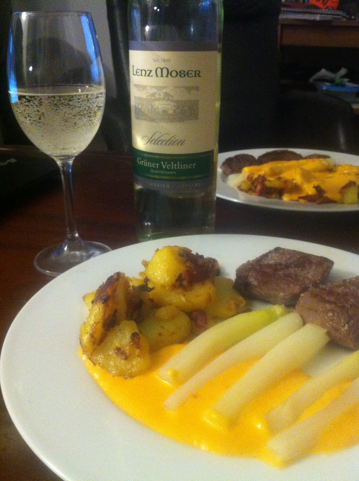 Zu den Rehmedaillons mit Bratkartoffeln und Spargel an Sambal-Hollandaise passt gut ein halbtrockener Weißwein...